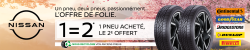 * Offre réservée aux particuliers, valable dans les concessions NISSAN Espace 3 (Saint-Grégoire – Cesson – Laval – Saint-Malo), pour l’achat de 2 ou 4 pneus CONTINENTAL, GOODYEAR, DUNLOP, BRIDGESTONE, DUNLOP du 26 mai au 13 juin 2025, Hors Pose, sous réserve d’une prise de rendez-vous préalable et des stocks disponibles.