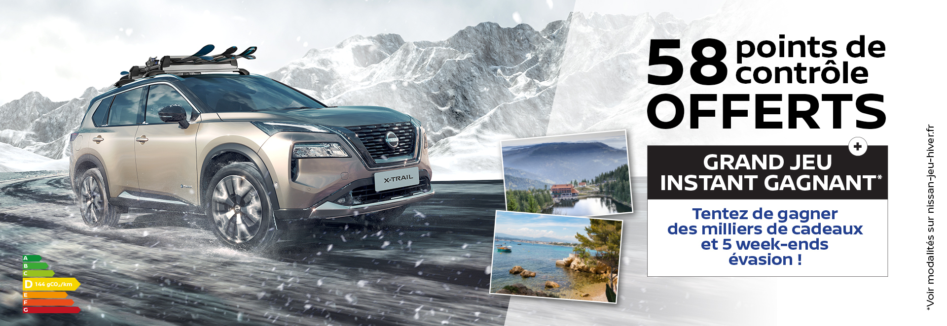 *Jeu sans obligation d’achat, soumis à conditions, du 08/01/2024 au 29/02/2024 ouvert à toute personne majeure résidant en France métropolitaine, propriétaire d’un véhicule Nissan et valable dans les concessions Nissan participantes. Pour participer au jeu, rendez-vous en concession pour un contrôle gratuit, à l’issue duquel vous sera
