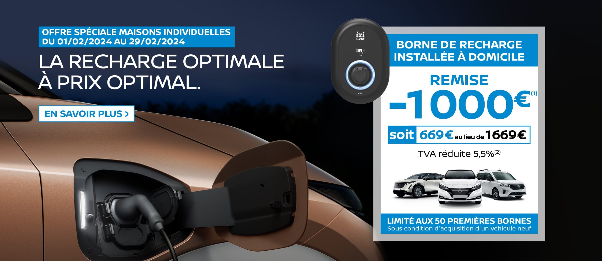 - Forfait Borne de recharge 7 kW fournie/posée est à -1000€ TTC (5.5% TVA, hors crédit d’impôt*).