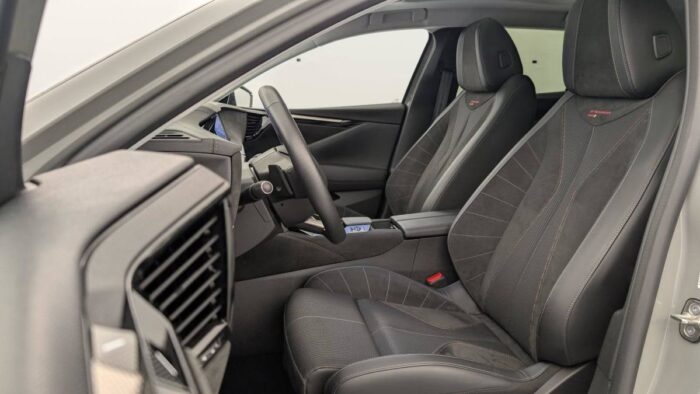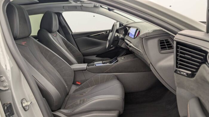 - Intérieur Tissu Tressé Basalte avec Alcantara : Planche de bord en alcantara Panneaux de portes en alcantara Console centrale en alcantara Sellerie en Tissu Tressé Basalte avec Alcantara et toile DS Décors de panneaux de porte Chrome guilloché Volant en cuir fleur Mistral avec surpiqûres Ciel de pavillon Salin