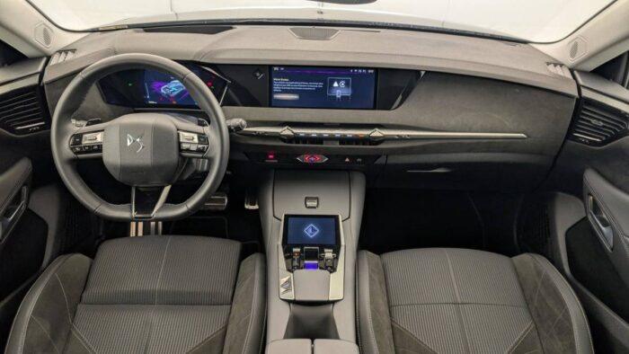 - Intérieur Alcantara Noir : Planche de bord en Alcantara Ciel de pavillon clair Décors de panneaux de porte Chrome guilloché Volant cuir Fleur Mistral Console en toile DS Noir Basalte Panneaux de porte en Alcantara et Toile DS Noir Basalte Sellerie en Tissu Tressé Basalte avec Alcantara et toile DS