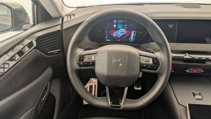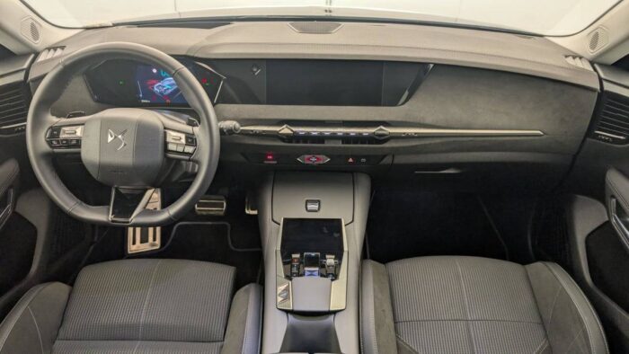 - Intérieur Alcantara Noir : Planche de bord en Alcantara Ciel de pavillon clair Décors de panneaux de porte Chrome guilloché Volant cuir Fleur Mistral Console en toile DS Noir Basalte Panneaux de porte en Alcantara et Toile DS Noir Basalte Sellerie en Tissu Tressé Basalte avec Alcantara et toile DS