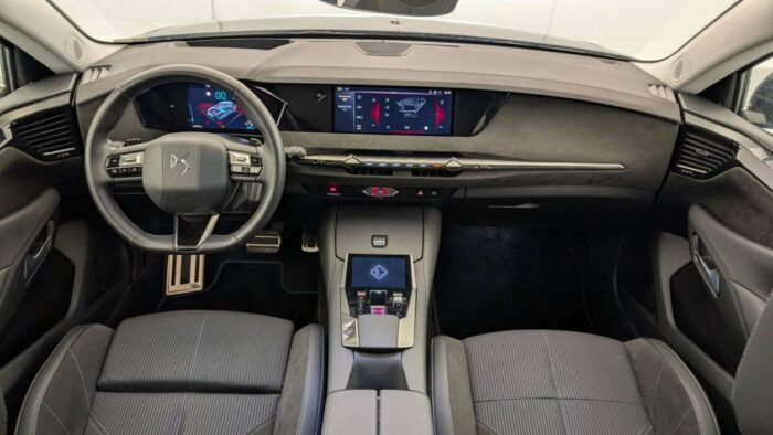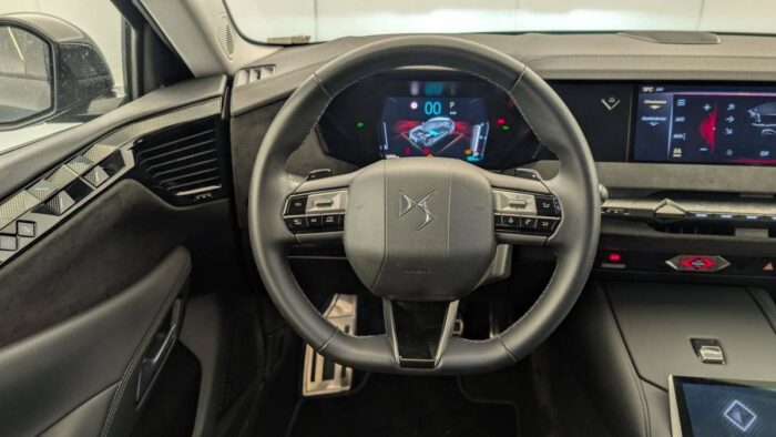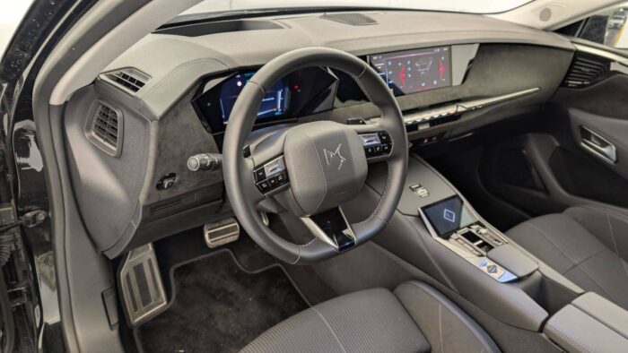 - Intérieur Alcantara Noir : Planche de bord en Alcantara Ciel de pavillon clair Décors de panneaux de porte Chrome guilloché Volant cuir Fleur Mistral Console en toile DS Noir Basalte Panneaux de porte en Alcantara et Toile DS Noir Basalte Sellerie en Tissu Tressé Basalte avec Alcantara et toile DS
