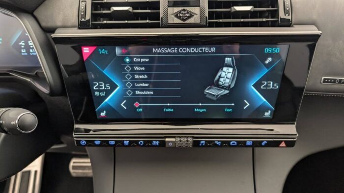 - Intérieur OPERA Noir Art Basalte : Sièges AV chauffants Commande Cristal Pare-brise chauffant Sièges AV massants Sièges AV ventilés Seuils de portes en métal avec Trame DS Volant Cuir avec surpiqûres Tramontane Grille de calandre noir brillant Pommeau de levier de vitesses en cuir lisse Guillochage « Clous de Paris » Plip avec insert Chromé Décors Cuir Nappa Noir Art Basalte avec surpiqûres "point perle" Terre de Cassel Sièges Cuir Nappa Noir Art Basalte confection bracelet Rétroviseurs extérieurs rabattables électriquement et indexés à la marche AR et à mémoire de position avec projection au sol du logo DS