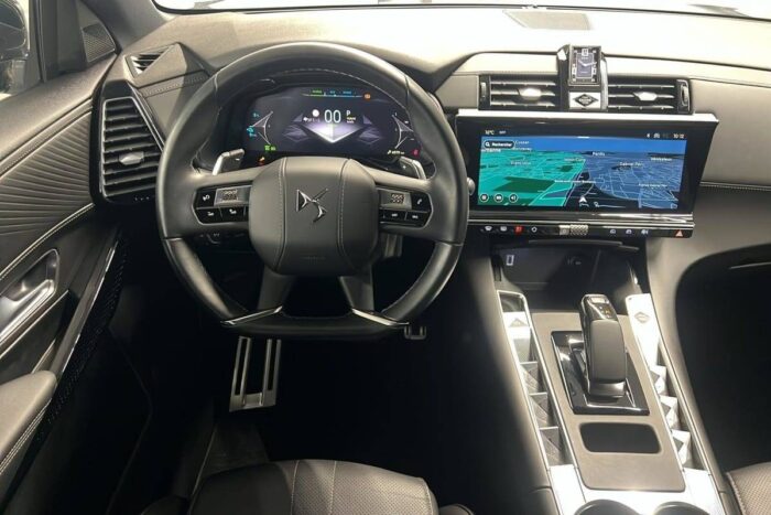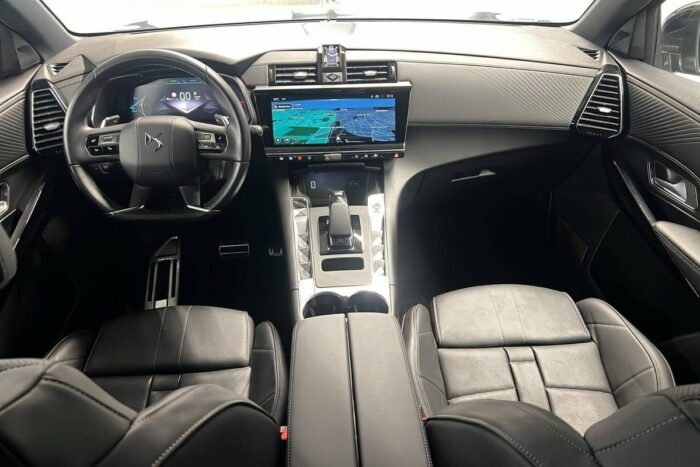 - Intérieur Cuir Nappa Noir Basalte : Panneaux de portes en Cuir Nappa Mistral Planche de bord en Cuir Nappa Mistral Console centrale en Cuir Nappa Mistral Volant Cuir fleur avec coussin d'airbag en cuir Sellerie Cuir Nappa confection bracelet et Toile DS Mistral Ciel de pavillon Sombre