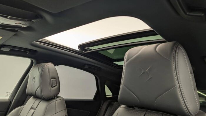 - Intérieur Cuir Nappa Noir Basalte : Panneaux de portes en Cuir Nappa Mistral Planche de bord en Cuir Nappa Mistral Console centrale en Cuir Nappa Mistral Volant Cuir fleur avec coussin d'airbag en cuir Sellerie Cuir Nappa confection bracelet et Toile DS Mistral Ciel de pavillon Sombre