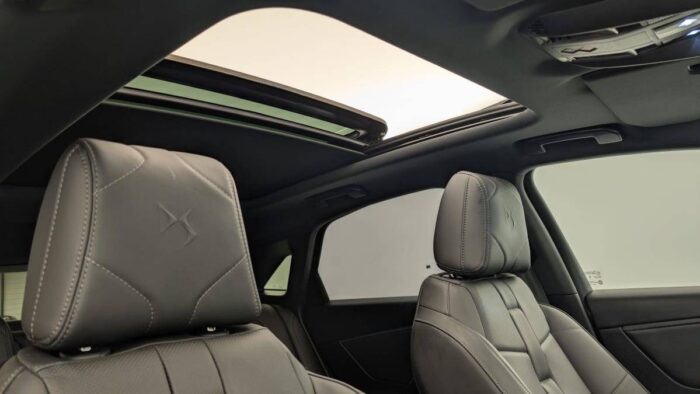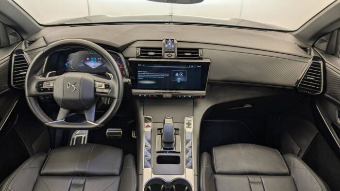 - Intérieur Cuir Nappa Noir Basalte : Panneaux de portes en Cuir Nappa Mistral Planche de bord en Cuir Nappa Mistral Console centrale en Cuir Nappa Mistral Volant Cuir fleur avec coussin d'airbag en cuir Sellerie Cuir Nappa confection bracelet et Toile DS Mistral Ciel de pavillon Sombre