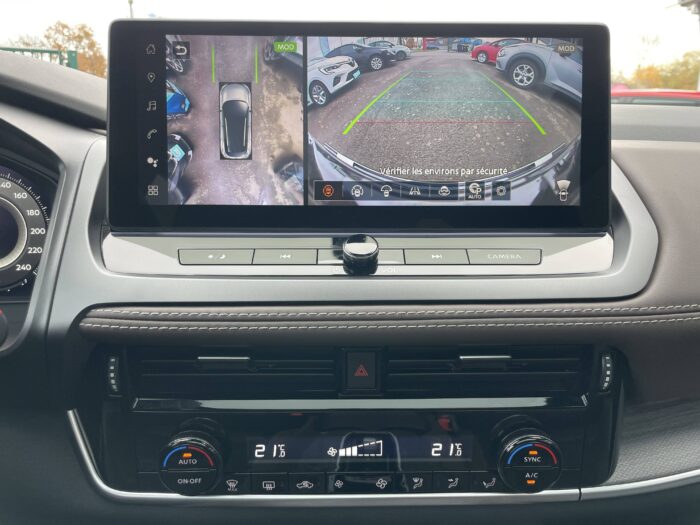 - Nissan AVM 3D - Vision Intelligente à 360° : système d'aide au stationnement qui facilite les manoeuvres de stationnement en vous offrant une vision à 360° : Caméra AR avec repères de gabarit, Caméra AV, Caméras latérales situées dans les rétroviseurs extérieurs, Radars 360°, Fonction ''capot transparent'', Mémorisation stationnement régulier et intersections