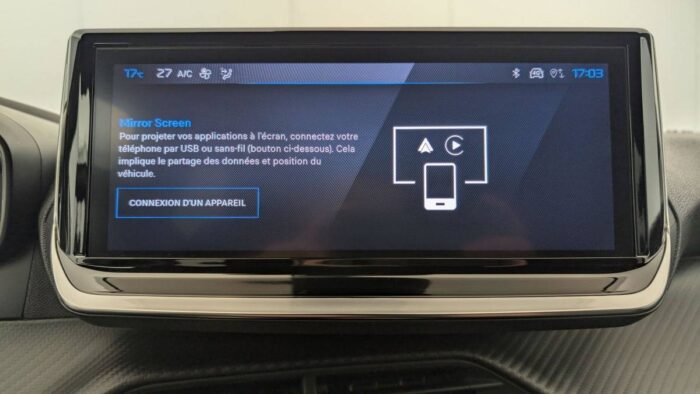 - Peugeot i-Connect: Radio DAB avec écran tactile couleur personnalisable 10" HD, Bluetooth - Mirror Screen sans fil (Apple CarPlay/Android Auto) - Wifi - 1 prise USB type C ( Data+charge), 1 prise USB type C (Charge) sur console AV