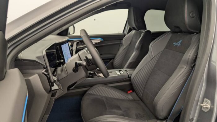 - Sellerie mixte Alcantara avec surpiqûres bleues et logo Alpine lumineux