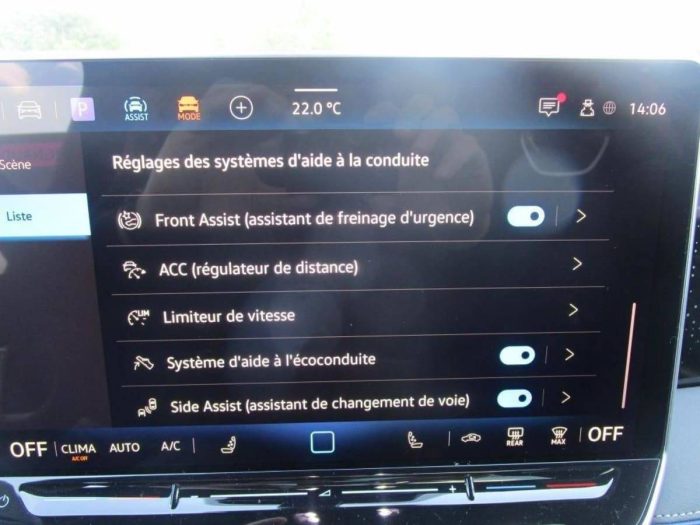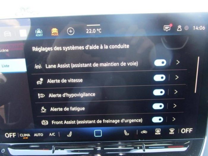 - Pack d'aides à la conduite 'IQ.DRIVE' Système de vision périmétrique Area view, Assistant de conduite semi-autonome 'Travel Assist', Protection proactive des occupants : Area View Contrôlez votre environnement à 360° et les obstacles grâce à ses 4 caméras dont les images sont diffusées en temps réel sur votre système d?infotainment Assistant de conduite semi-autonome 'Travel Assist' combine le régulateur de distance 'ACC', l'assistant de maintien dans la voie ?Lane Assist?, l'assistant au changement de voie 'Side Assist' et' l'Emergency Assist'. Dans les limites inhérentes au system Système de protection proactive des occupants fermeture automatique des vitres et du toit ouvrant et resserrage des ceintures en cas de détection d?un danger imminent